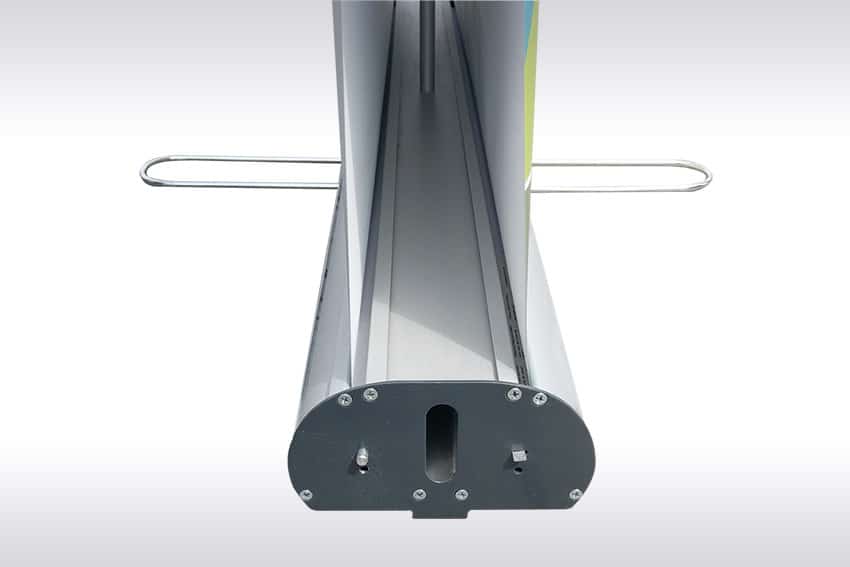 A large, capacious cassette for two folded graphics. These double-sided roll-up stands offer twice as much space for communication. Thanks to the use of an enlarged cassette, the graphics can be displayed on both sides!